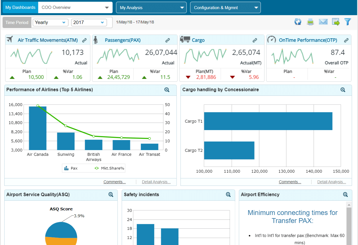 Core Vitals operations module offers comprehensive analyses to COO’s and senior operations executives to enable them to increase efficiencies, reduce costs and deliver a compelling passenger experience. The Core Vitals operations module covers all areas concerning airport operations including passenger traffic, Airport Operations Analytics, air traffic movement, on-time performance, terminal activities, resource utilization, aviation safety and others